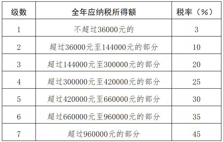 (注1:本表所称全年应纳税所得额是指依照本法第六条的规定,居民个人取得综合所得以每一纳税年度收入额减除费用六万元以及专项扣除、专项附加扣除和依法确定的其他扣除后的余额。